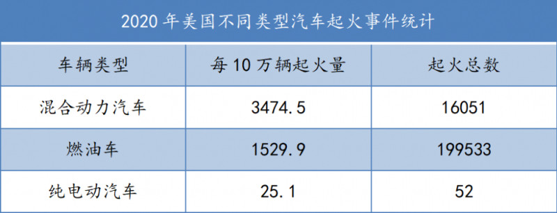 不仅如此,据AutoInsurance EZ的一项调查结果显示,2020年美国140万起火灾事故中,汽车起火的比例为15%,约为20万宗。其中,燃油车超过10万宗,混合动力汽车1.6万宗,纯电动车只有52宗。该机构结合美国汽车保有量计算得出,每10万辆汽车中发生火灾的车型比例为:混合动力汽车3475辆,燃油车为1529辆,纯电动车仅有25辆,起火率远低于前两者。